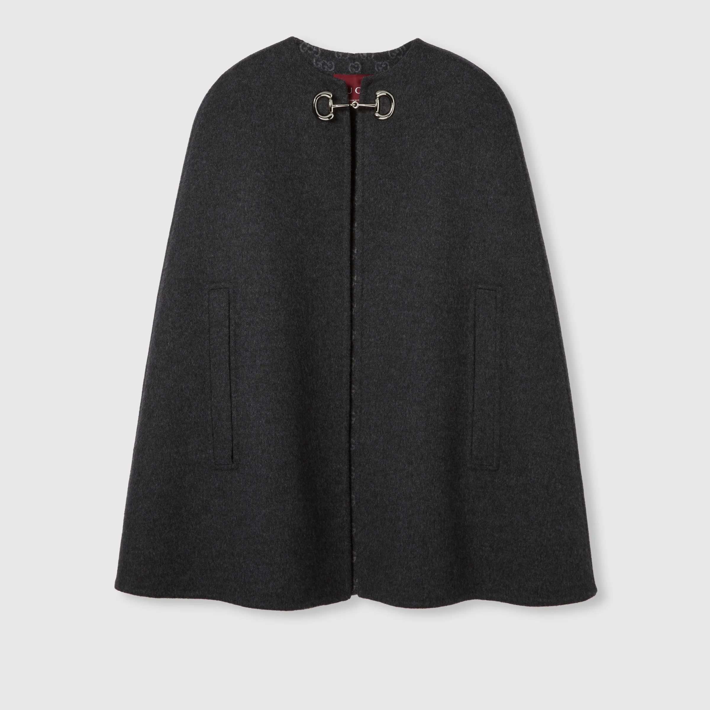 The Cruise 2026 women's ready-to-wear collection highlights sumptuous materials on essential silhouettes to usher in the colder season. Crafted from dark grey silk wool, this cape features the GG motif on the inside, while a Horsebit detail completes the piece. - Dark grey silk wool on one side and GG silk wool on the other - Horsebit - Two side pockets - Length: 30.7"
