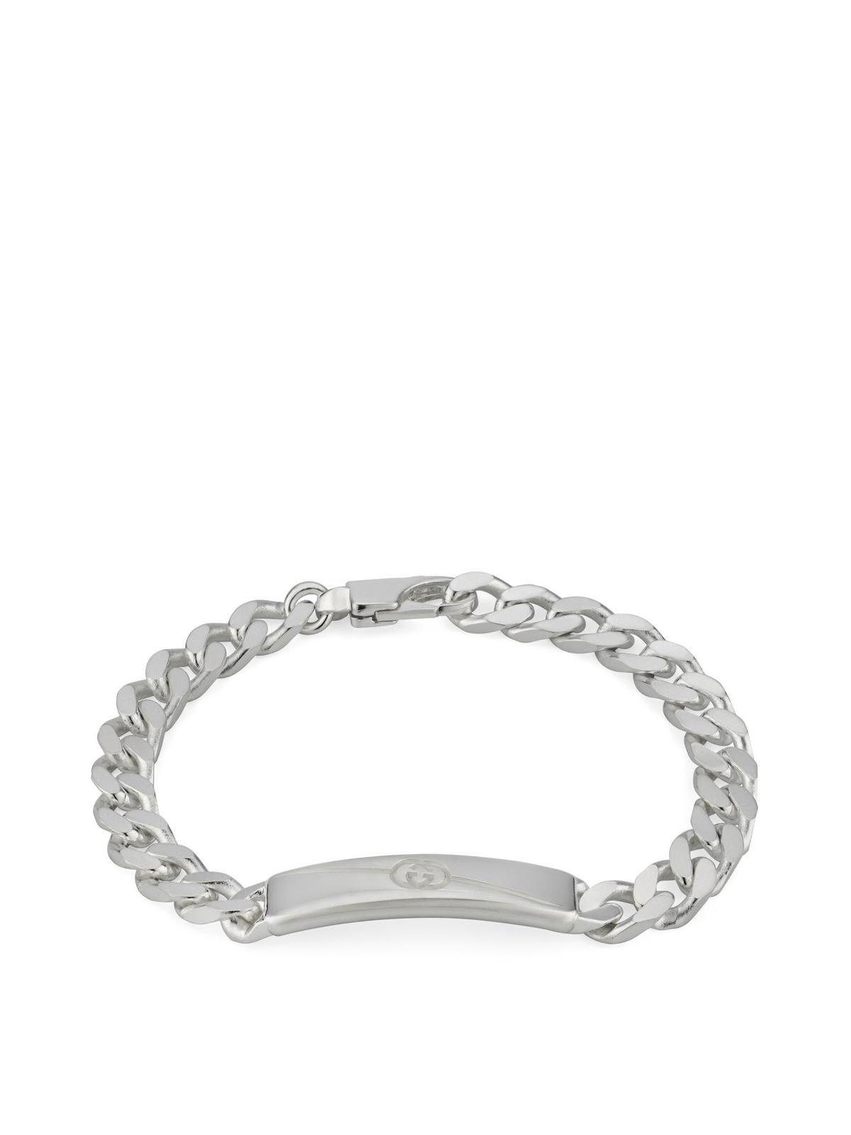 Product code: 75318211 Famed for its timeless elegance and unparalleled artistry, Gucci presents the Diagonal Interlocking G Bracelet. Meticulously constructed in the finest 925 sterling silver, this stunning bracelet is secured with a clasp closure on the rear. No Gucci design is complete without its signature Diagonal Interlocking G motif engraved on the tag detailing, ensuring brand recognition and exclusivity. Clean with a soft cloth and store separately to ensure the best condition.
