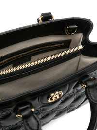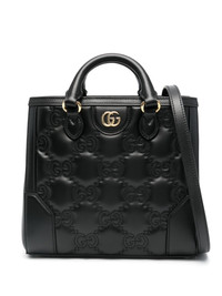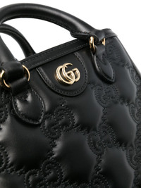small GG matelasse top-handle bag Crafted from supple black-hued leather, this mini tote bag from Gucci takes a less subtle approach to its logomania aesthetic. Adorned with the brand's iconic GG logo plaque to the front, the piece is complete with all-over logo embroidered detailing. Highlights - Black - Leather - Smooth grain - Matelasse effect - Signature gg supreme embroidery - Signature double g logo - Logo-engraved gold-tone hardware - Internal logo patch - Metal feet - Open top - Two rolled top handles - Two adjustable detachable shoulder straps - Partitioned compartment - Two internal patch pockets - Two internal zip-fastening pockets - Canvas lining - This piece comes complete with a protective dust bag. Made in Italy Composition Outer: Leather 100% SIZE & FIT Model measurements Height 5 ft 11 in(1.8 m) Bust/Chest 32.67 in(83 cm) Hips 36.22 in(92 cm) Waist 24.4 in(62 cm) Measurement DEPTH 3.93 in(10 cm) HEIGHT 8.66 in(22 cm) WIDTH 9.05 in(23 cm)