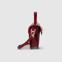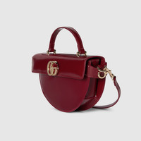 Introducing a half-moon shaped top handle bag, this style from the women's Fall Winter 2024 runway reinterprets an archival piece with a new Double G closure. It is crafted with a unique cutting technique, and makes a clicking sound when it is turned. This small size in Gucci Rosso Ancora red has an outside pocket, and is complete with a detachable shoulder strap. - Gucci Rosso Ancora red shiny leather - Light gold-toned hardware - Gucci Rosso Ancora red leather lining - Double G - Inside: 1 zip pocket with Double G zip puller - Outside: 1 open pocket on the back - Handle drop: 3.1" - Detachable and adjustable leather shoulder strap with 21.9" drop - Turnlock closure - Small: 11.2"W x 6.1"H x 2"D - Weight: 1.3lbs, approximately - Made in Italy - Fits up to: iPhone Pro Max/Plus, long wallet, and lipstick
