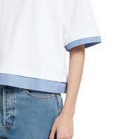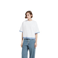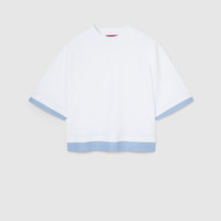 Perfect for the seaside, maritime-inspired designs enrich casual silhouettes with stripes, lightweight materials, and signature motifs in the Pre-Fall 2025 collection. This jersey T-shirt is elevated with a blue striped cotton trim. - White soft jersey - Blue striped cotton trim - Gucci embroidery - Crewneck - Wide short sleeves - Made in Italy