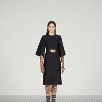 Gucci transcribes its heritage, creativity, and innovation into a plenitude of collections. From staple items to distinctive accessories, from the everyday wardrobe to special occasions, the House's beloved motifs embellish ready-to-wear, handbags, shoes, and other collections. This tailored midi dress reveals a sophisticated silhouette with minimalistic details, defined by a contrasting leather belt with G buckle closure. - Black soft wool silk - Lined - Concealed placket with button detail - Two concealed front pockets - Short flared sleeves with turn-up cuffs - Detachable leather belt with bold rectangular G buckle closure - Zip closure - Length: 43.3", based on a size 40 (IT) - The model is 5'8" and is wearing size 40 (IT)
