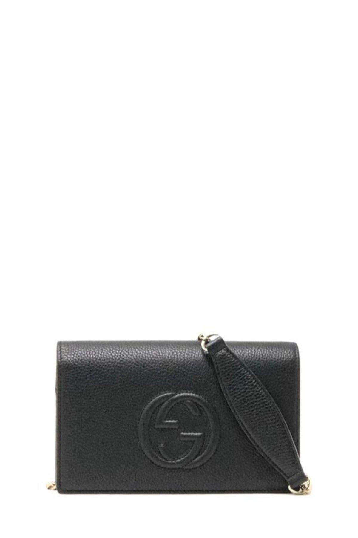 Gucci Soho shoulder bag in black leather. Featuring an embossed front logo, flap and button closure, internal card holder and zip pocket. Chain shoulder strap with leather shoulder strap. Dimensions: 20 x 12 x 4 cm Colour: Black Made In: Italy COD: 598211A7M0G6523 Dimensions: 20 x 12 x 4 cm Composition: 100% Leather