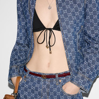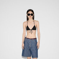This halterneck bikini appears as part of the Cruise 2025 collection. Crafted from a sparkling jersey, it's enriched with lace ties and Round Interlocking G hardware. - Black sparkling jersey - Round Interlocking G hardware - Halterneck - Please note that intimates, including swimwear, tights, socks and lingerie can only be returned in new condition. Items should be unworn, in their original packaging and with all labels attached. - Laces that tie at the front, neck and sides - Made in Italy - The model is 5'8" and is wearing size small