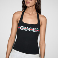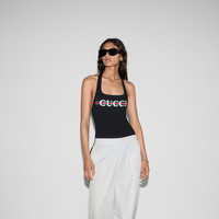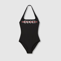 This halterneck swimsuit appears as part of the Cruise 2025 collection. Crafted from a black sparkling jersey, it's defined by a contrasting Gucci Web print. - Black sparkling jersey - Gucci Web print - Halterneck - Scoop neck - High leg - Please note that intimates, including swimwear, tights, socks and lingerie can only be returned in new condition. Items should be unworn, in their original packaging and with all labels attached. - Made in Italy - The model is 5'9" and is wearing size small