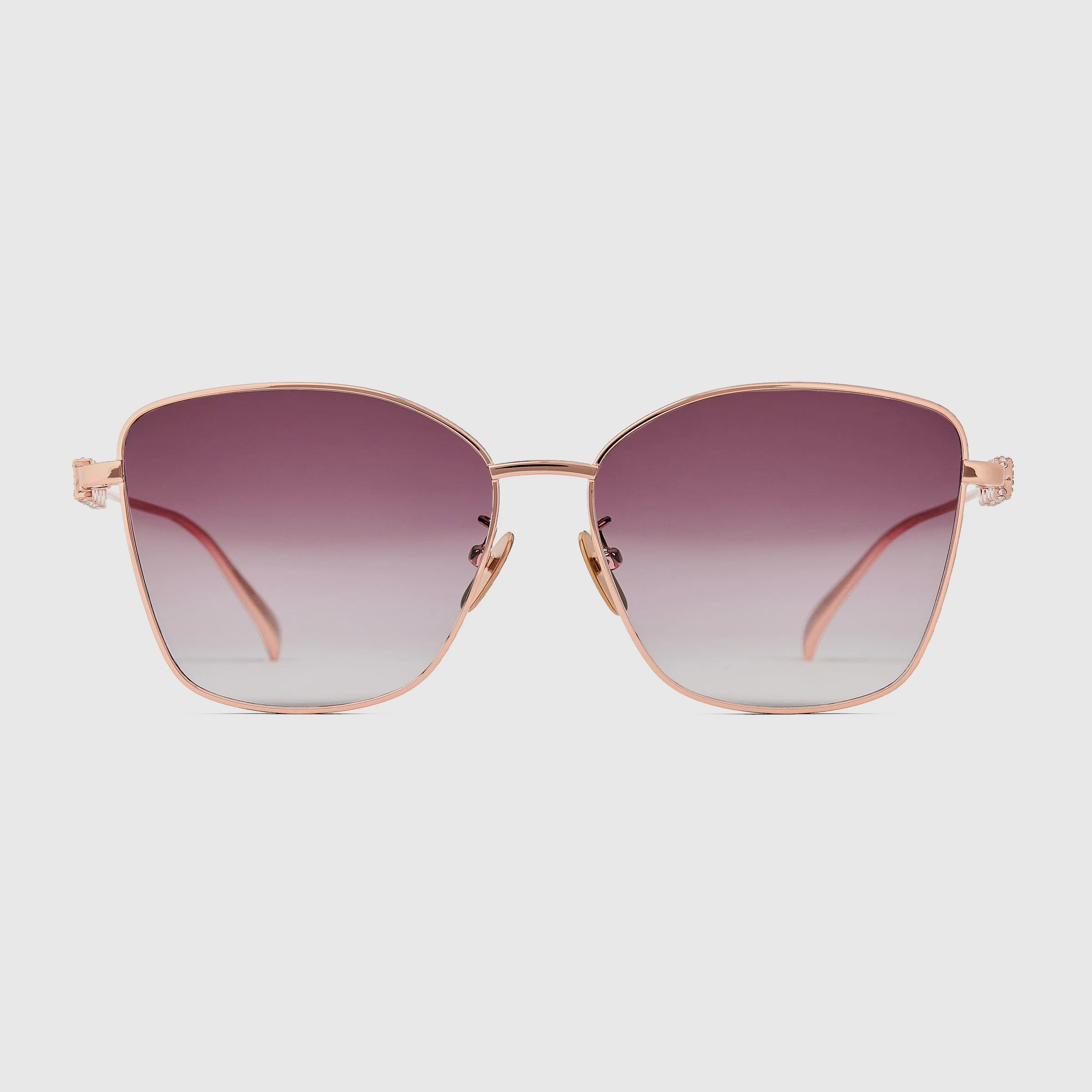 The Cruise 2025 eyewear collection blends an effortless silhouette with a metal frame in a sleek design. These sunglasses feature a butterfly shape and the crystal-set Gucci logo in small letters on the temples. - Shiny rose gold-toned metal frame - Shiny rose gold-toned metal temples with cut-out Gucci logo and crystals - Gradient Gucci Rosso Ancora red lens - 100% UVA/UVB protection - GG1914SA - Temple length: 5.7"; Lens height: 2"; Nose bridge length: 0.6" - Frame height: 2"; Frame width: 5.9"; Hinge to hinge: 5.6" - Made in Japan - The eyewear case in the House’s signature Gucci Rosso Ancora red hue is complete with a magnetic closure and white interior.
