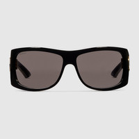 Introducing Spring Summer 2026. Distinctive eyewear shapes are enriched with emblematic signatures that create a fil rouge in the collection. This style is featured in the "Party Boy" look of La Famiglia. Presented with a black injection frame, it reveals a Double G metal detail and logo metal plaque across the temples and a grey lens. - Black injection frame - Black injection temples with Double G metal detail outside, and logo metal plaque on the inside - Grey lens - 100% UVA/UVB protection - GG2170S - Temple length: 4.9"; Lens height: 1.7"; Nose bridge length: 0.5" - Frame height: 2"; Frame width: 5.4"; Hinge to hinge: 4.8" - Made in Japan - The eyewear case in black is complete with a magnetic closure and GG motif interior.