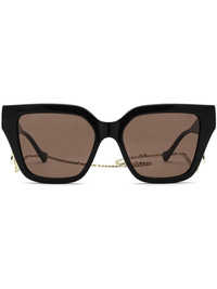 square-frame sunglasses black square frame brown tinted lenses logo plaque at the arm curved arms chain-link neck strap These glasses come with a protective case. Made in Italy Composition Acetate 100% SIZE & FIT Measurement Arm Length 5.51 in(14 cm) Bridge Width 0.66 in(1.7 cm) Lens Diameter 2.12 in(5.4 cm)