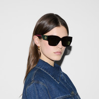 The Pre-Fall 2024 eyewear collection successfully combines the coveted silhouettes of bygone decades with a contemporary logo feel. Here, a shiny dark tortoiseshell acetate frame pairs with an Interlocking G motif. - Shiny dark tortoiseshell acetate frames - Shiny double layered green and red acetate temples with Interlocking G - Solid dark green lens - 100% UVA/UVB protection - GG1663S - Temple length: 5.5"; Lens height: 1.7", Nose bridge length: 0.8" - Made in Italy - The Rosso Ancora packaging, a distinctive color chosen by Creative Director Sabato De Sarno to mark the beginning of Gucci's new creative chapter, includes a vinyl case and satin pouch. - Frame height: 2"; Frame width: 5.7"
