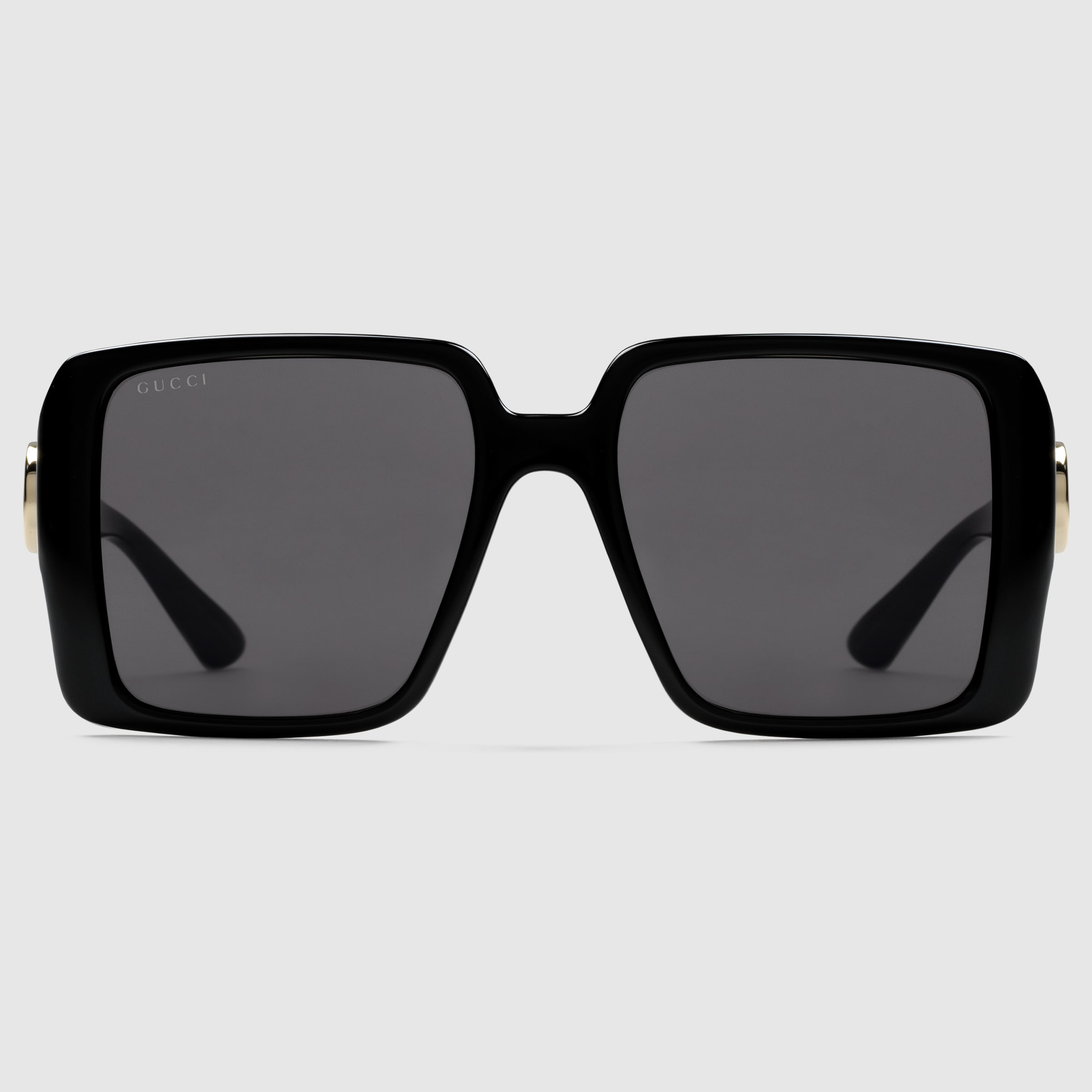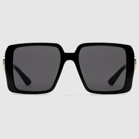 The Pre-Fall 2024 eyewear collection successfully combines the coveted silhouettes of bygone decades with a contemporary logo feel. Here, a shiny black injection frame pairs with an Interlocking G motif. - Shiny black injection frames - Shiny black injection temples with Interlocking G - Solid grey lens - 100% UVA/UVB protection - GG1692S - Temple length: 5.3"; Lens height: 1.9", Nose bridge length: 0.7" - Frame height: 2.1"; Frame width: 5.5" - Made in Japan - The Rosso Ancora packaging, a distinctive color chosen by Creative Director Sabato De Sarno to mark the beginning of Gucci's new creative chapter, includes a vinyl case and satin pouch.