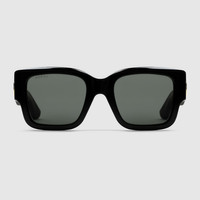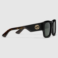 The Pre-Fall 2024 eyewear collection successfully combines the coveted silhouettes of bygone decades with a contemporary logo feel. Here, a shiny black acetate frame pairs with an Interlocking G motif. - Shiny black acetate frames - Shiny double layered black and dark tortoiseshell temples with Interlocking G - Solid grey lens - 100% UVA/UVB protection - GG1663S - Temple length: 5.5"; Lens height: 1.7", Nose bridge length: 0.8" - Made in Italy - The Rosso Ancora packaging, a distinctive color chosen by Creative Director Sabato De Sarno to mark the beginning of Gucci's new creative chapter, includes a vinyl case and satin pouch. - Frame height: 2"; Frame width: 5.7"