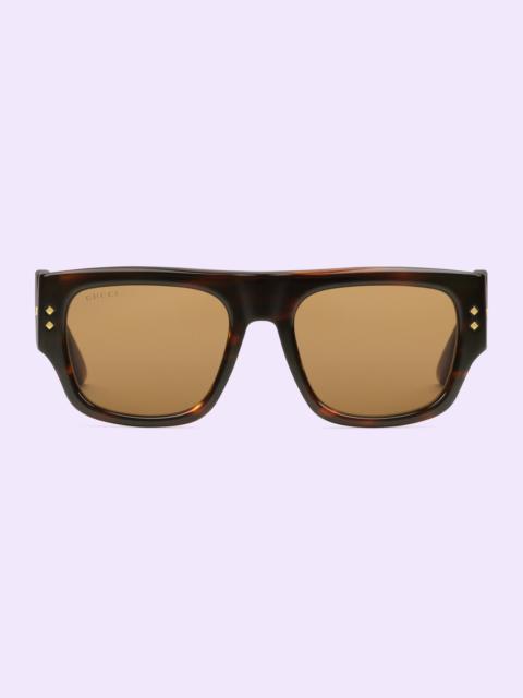 Gold-toned metal rivets decorate the tortoiseshell acetate frame and temples, while the name of the House appears along the side for a subtle logo feel. - Shiny black acetate frame with metal rivets - Shiny black acetate temples with metal rivets and Gucci logo detail - Solid grey lens - The glasses will arrive in a velvet case, available in a range of six jewel-toned colors and paired with a coordinating satin lining. The case color will be individually selected for each pair of glasses and comes with a matching satin flannel pouch and ivory microfiber cloth.