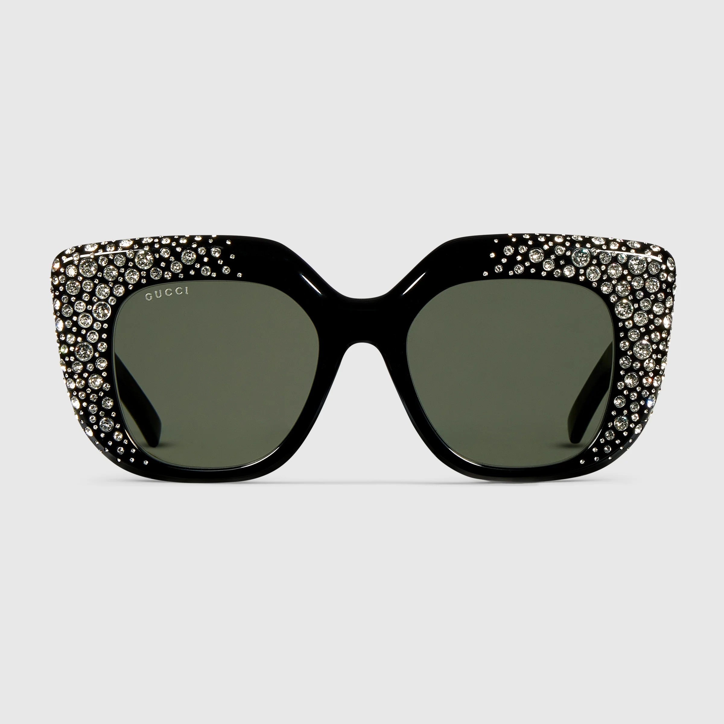 The House's eyewear collection continues to reinterpret emblematic motifs, from the GG, Web, bamboo, Horsebit and equestrian inspirations, in sumptuous materials, intricate craftsmanship, and fresh hues. Crafted in shiny black acetate, these square frame sunglasses reveal hand-applied, gradient-effect crystals across the front. - Shiny black acetate sculpted edge frame with hand-applied, gradient-effect crystals in different sizes - Shiny black acetate temples with Double G - Solid grey lens - 100% UVA/UVB protection - GG2030S - Temple length: 5.5"; Lens height: 1.7"; Nose bridge length: 0.7" - Frame height: 5.7"; Frame width: 2.3"; Hinge to hinge: 5" - Made in Italy - The eyewear case in black is complete with a magnetic closure and GG motif interior.