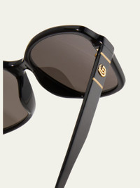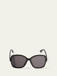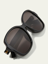 Gucci square sunglasses in injection plastic. Eye/bridge/temple (in mm): 57-16-145. Monochromatic lenses; logo script. Interlocking GG at temples. 100% UVA/UVB protection. May be fitted with prescription lenses. Made in Italy. Online Inquiries: BGS21_D3MA0| Store Inquiries: #3384476