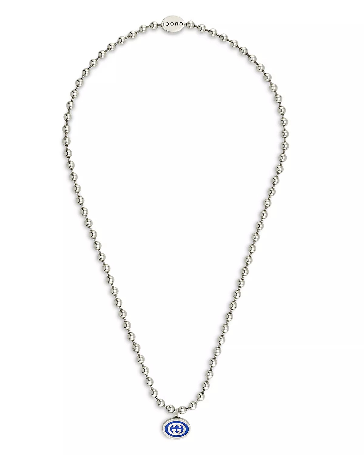 SIZE & FIT - Founded in Florence in 1921, Gucci is one of the world's leading luxury fashion brands, with a renowned reputation for creativity, innovation, and Italian craftsmanship. - Reflecting and defining the styles and attitudes of each era, Gucci has influenced fashion and culture for more than a century. PRODUCT DETAILS - From the Boule collection - A blue enamel double G logo falls from a polished bead chain - Sterling silver - 21.6"L; pendant: 0.6"L x 0.7"W - Slide & lock clasp closure - Photo may have been enlarged and/or enhanced - Some silver jewelry may be surface-coated with rhodium to enhance metal color and shine; it may wear off over time requiring replating. - Made in Italy Web ID: 4709473