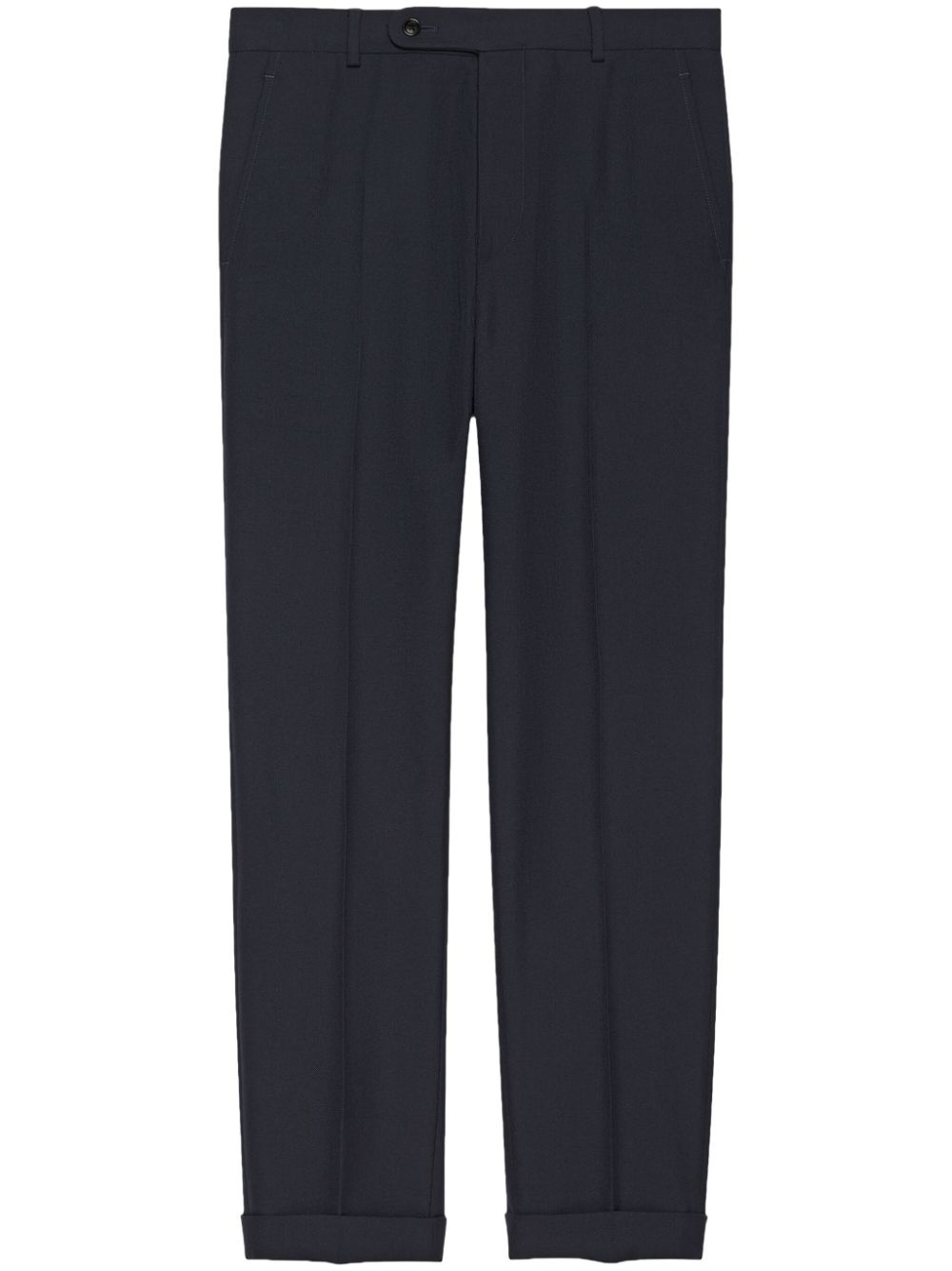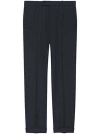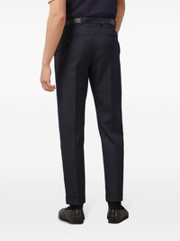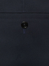 mid-rise tailored twill trousers Highlights - Navy blue - Twill weave - Logo patch to the rear - Pressed crease - Mid-rise - Belt loops - Concealed fly and button fastening - Two side slash pockets - Two rear button-fastening jetted pockets - Tailored cut - Straight leg Made in Italy Composition Outer: Polyester 55%, Wool 45% Lining: Cotton 100% SIZE & FIT Model measurements Height 6 ft 1 in(1.86 m) Bust/Chest 36.61 in(93 cm) Hips 37 in(94 cm) Waist 28.74 in(73 cm) FittingInformation Designed for a slim fit, offering a comfortable fit that sits just away from the leg Made from a midweight non-stretch fabric This piece fits true to size – take your usual size Washing instructions Dry Clean Only