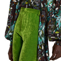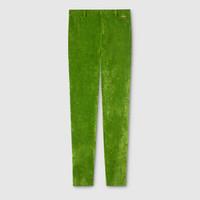 The Cruise 2026 women's ready-to-wear collection reinterprets 1990s modernism with sleek silhouettes, anchored in monochromatic black or white, and effortless separates complete with leggings. This pair of leggings appears in green stretch velvet. - Green stretch velvet - Unlined - Belt loops - Front zip closure - Length: 40.5"; Hem width: 10.3"