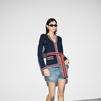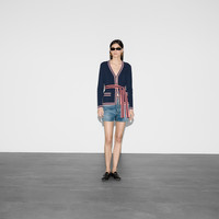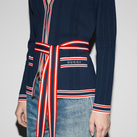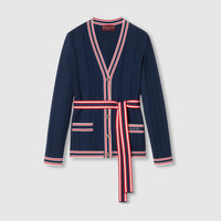 Inspired by the summer spirit and beach clubs on the Italian coast, this item is part of Gucci Lido. Tops and bottoms from jersey to denim and other materials open up numerous styling possibilities. This self-tie cardigan appears in a fine stretch viscose, allowing for easy movement and wear. A contrasting stripe trim and Gucci embroidery completes the design with a refined nod to the House. - Dark blue fine stretch viscose - Red and white stripe trim - Round Interlocking G enamel buttons - Gucci embroidery - V-neckline - Two patch pockets - Detachable self-tie belt - Button closure - Length: 26.7", based on a size S - Made in Italy - The product shown in this image is a size extra small