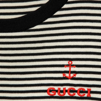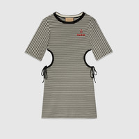 The stark contrast between black and white has inspired a series of eye-catching motifs in the new collection. This T-shirt dress reveals bold cut-out panels with self-tie bow details, while a Gucci anchor embroidery brings a pop of color to the piece. - Black and white striped cotton - Gucci anchor embroidery - Crewneck - Short sleeves - Cut-out detail - Two self-tie bows - Length: 32.8" based on a size small - The product shown in this image is a size small