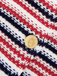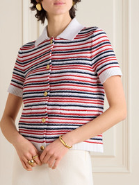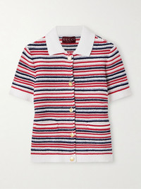 Gucci's shirt is jacquard-knitted from a cotton-blend with white, red and navy stripes throughout. It has a slightly loose fit and ribbed trims, including a neat polo collar. The gold-tone buttons are etched with the crest. Wear yours with jeans or tailoring. Size & Fit - Fits true to size, take your normal size - Designed for a slightly loose fit - Lightweight knit - Model is 180cm/ 5’11” and is wearing a size Small Model measurements: - Bust: 81cm/ 32" - Waist: 63cm/ 25" - Hip: 91cm/ 36" Details & Care - White, red and navy cotton-blend - Button fastenings through front - 95% cotton. 5% polyamide - Dry clean