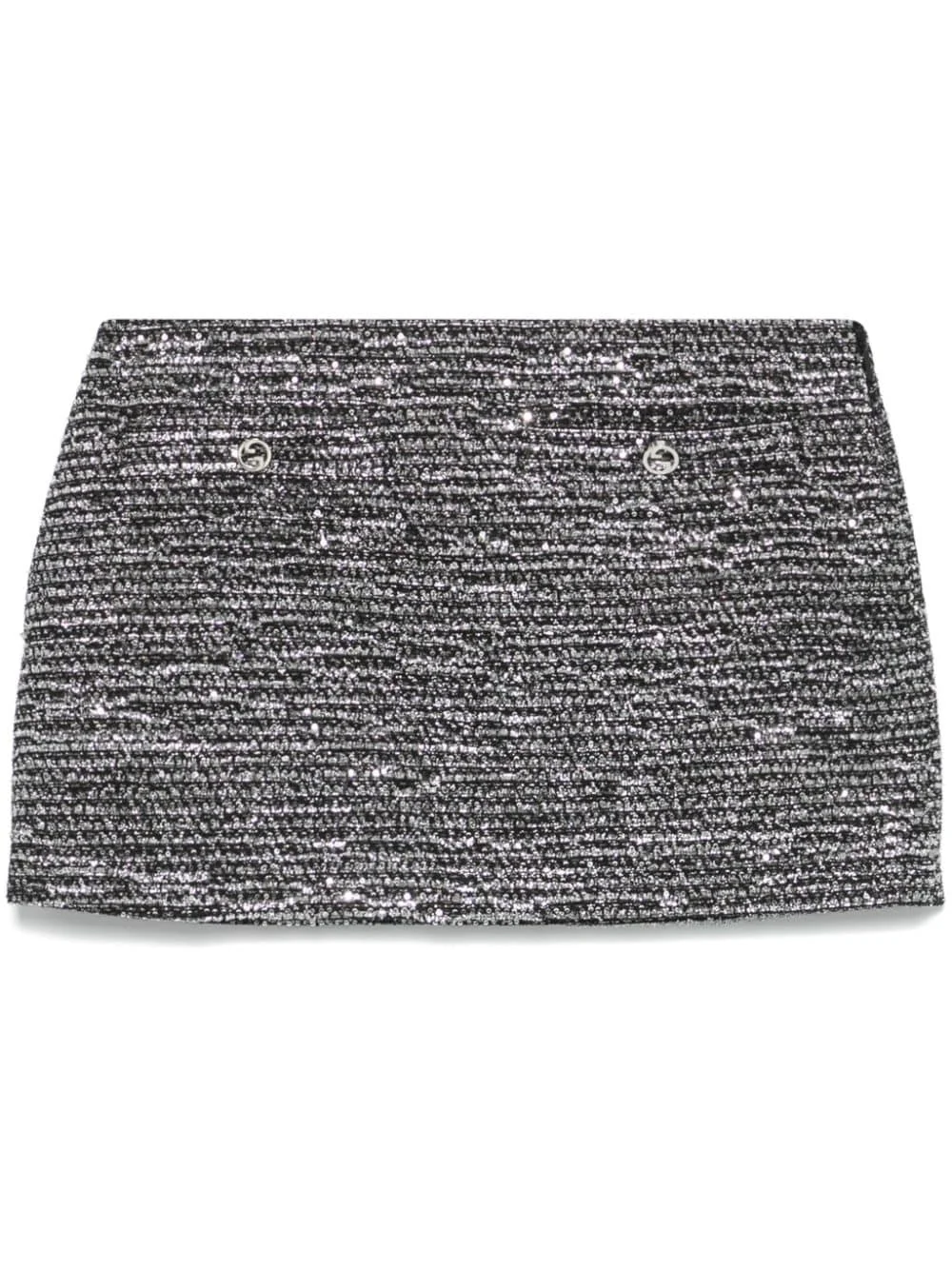striped tweed mini skirt Highlights - Black/silver-tone - Tweed - Lame effect - Horizontal stripe pattern - Concealed side zip fastening - Sequin embellishment - Signature interlocking g buttons - Two front welt pockets - Two side slit pockets - Full lining - Straight hem - Thigh-length Made in Italy Composition Outer: Wool 50%, Polyamide 30%, Metallic Fibre 9%, Polyester 7%, Viscose 4% Lining: Acetate 75%, Silk 25% SIZE & FIT Model measurements Height 5 ft 10 in(1.78 m) Bust/Chest 33.46 in(85 cm) Hips 36.22 in(92 cm) Waist 23.22 in(59 cm) FittingInformation This mini-length skirt is intended to be worn low on the hips Made from a midweight non-stretch fabric