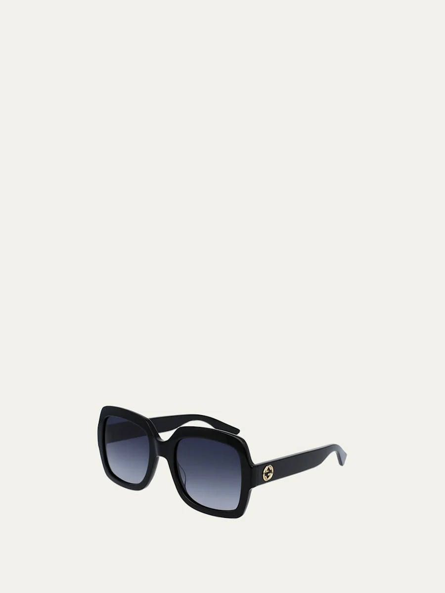 Gucci classic oversized sunglasses in acetate. Lens/bridge/temple (in mm): 54-22-140. Gradient rectangular lenses; logo embossing at right. Interlocking GG detail at temples. Chunky arms. 100% UVA/UVB protection. Can be fitted with prescription lenses. Made in Italy. Online Inquiries: BGS21_D2H5T| Store Inquiries: #2076386