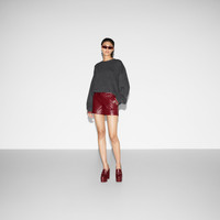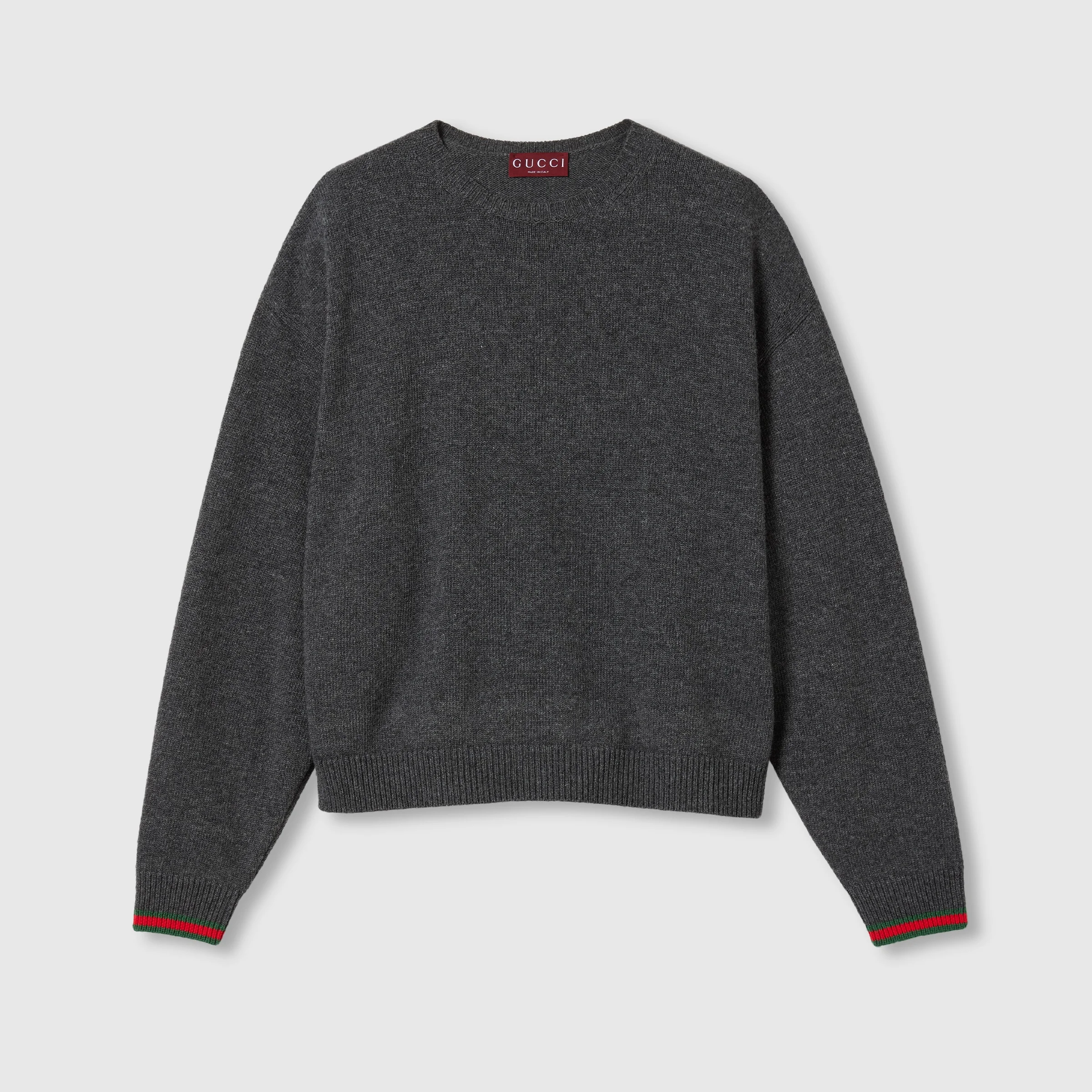 Introducing new knitwear styles, sophisticated yarn provides volume, and is further elevated through artisanal details which highlight rich textures. With a new focus on yarns, these knits can be worn alone as a standout piece, or layered to complement the Fall Winter 2024 wardrobe. This crewneck wool and cashmere top is enriched with a green and red Web trim on the cuffs. - Dark grey wool and cashmere - Crewneck - Dropped shoulder - Web trim on cuffs - Rib trim - Length: 24.8"; based on a size S - Made in Italy - The product shown in this image is a size small