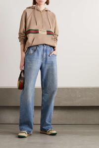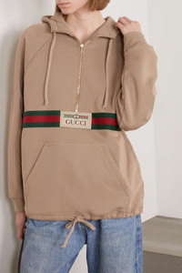 EDITORS'NOTES Gucci's hoodie calls out its heritage with a retro logo and striped webbing trims. Designed in a relaxed shape, it's cut from organic cotton-jersey with drawstrings at the hood and hem so you can customize the fit. This product was created using Considered Materials. Find out more about NET SUSTAIN here. SIZE & FIT - Fits true to size, take your normal size - Designed for a loose fit - Drawcord hem for a flexible fit - Mid-weight, slightly stretchy fabric - Model is 180cm/ 5’11” and is wearing a size Small DETAILS & CARE - Light-brown organic cotton-jersey, green and red twill - Zip fastening along front - 100% organic cotton; trim1: 44% acrylic, 44% wool, 12% viscose; trim2: 100% polyester - Hand wash