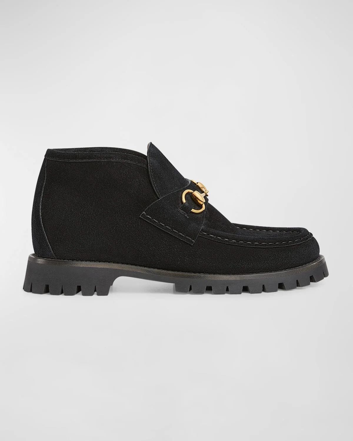 - Gucci "Sylke" suede moccasin booties with golden bit strap - Flat heel - Round moc toe - Notched vamp - Slip-on style - Rubber outsole - Made in Italy - Size Note: Item runs small, consider ordering a size up.