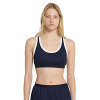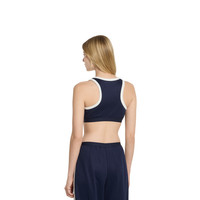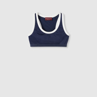 Sporty silhouettes speak to both the fine craftsmanship and modern approach that have to come to define Gucci's latest ready-to-wear. For Pre-Fall 2025 this technical jersey top features a white trim and embossed Double G. - Dark blue technical jersey - White trim - Embossed Double G detail - Scoop neck - Racer back - Gucci elastic hem - Cropped - Made in Italy