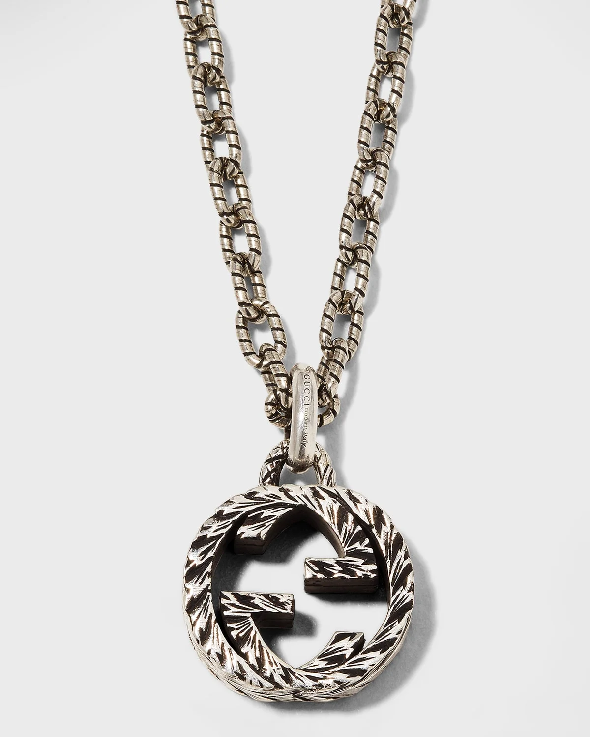 - Gucci necklace with textured chain and pendant. - Round interlocking G pendant. - 925 sterling silver. - Lobster clasp closure. - Approx. 17.5"L. - Made in Italy.