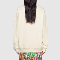This white heavy cotton sweatshirt is part of The North Face x Gucci collection, a collaboration connecting two brands with similar history and values in celebration of the spirit of exploration. The North Face has a rich archive pushing innovation and breaking the rules in creating styles with unique and distinguishing design details. As a brand that has embraced inclusivity, beginning with supporting women to achieve results in a male-dominated pursuit, its mission for its creations is to help adventurers make physical discoveries but also discover their self while doing so. The cross-category collection for men and women includes ready to wear, soft accessories, luggage and shoes. - The North Face x Gucci - White heavy felted cotton jersey with The North Face x Gucci logo print - This product contains organic cotton where the cultivation and manufacturing process restrict the use of chemicals, eliminate pesticides or artificial fertilizers and incorporate methods that respect biodiversity, improve soil quality, and reduce water consumption. - Crewneck - Oversized fit - Length: 27", based on a size medium - Made in Italy - The product shown in this image is a size medium