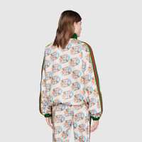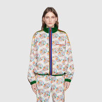 This zip jacket is part of The North Face x Gucci collection, a collaboration connecting two brands with similar history and values in celebration of the spirit of exploration. For this new chapter, the logo is presented in a multicolor variation. The North Face has a rich archive pushing innovation and breaking the rules in creating styles with unique and distinguishing design details. - Multicolor The North Face x Gucci logo print ivory technical jersey - Green and red Web stripes down the arms - The North Face x Gucci - Multicolor The North Face x Gucci logo patch on the front - High neck - Zip pocket on the front - Elastic cuffs - Made in Italy - The model is 5'7" tall. The product shown in this image is a size small