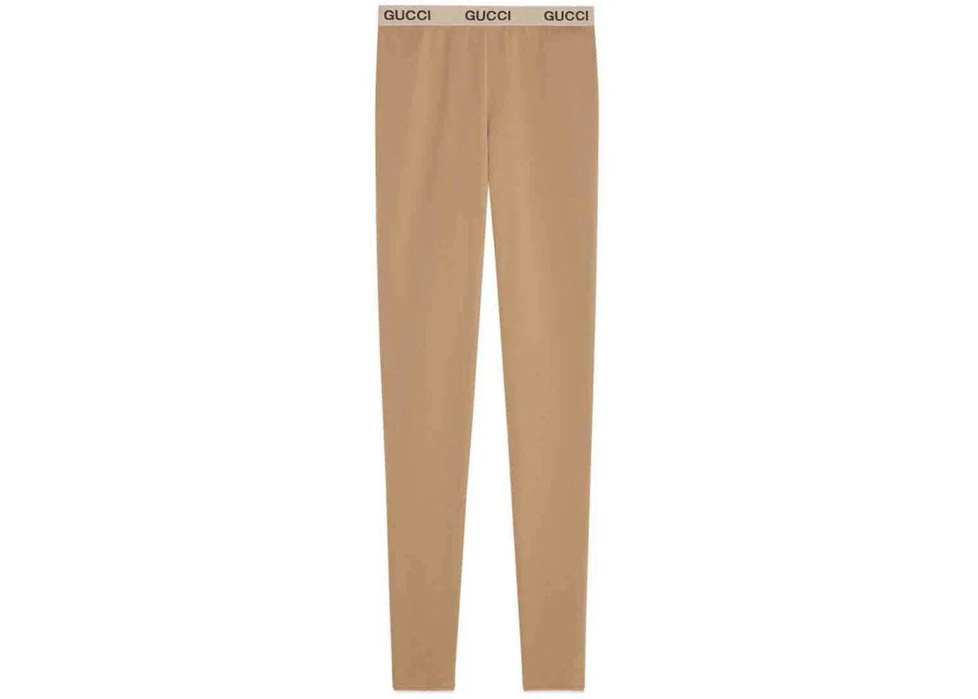 These jersey leggings are part of The North Face x Gucci collection, a collaboration connecting two brands with similar history and values in celebration of the spirit of exploration. The pieces are characterized by a selection of bright colors and prints featuring The North Face x Gucci logo, flowers and woodland-inspired motifs. - Camel technical jersey - The North Face x Gucci Web logo embroidery - The North Face x Gucci - Elastic waistband with The North Face x Gucci logo - Made in Italy - The model is 5'8" tall. The product shown in this image is a size small