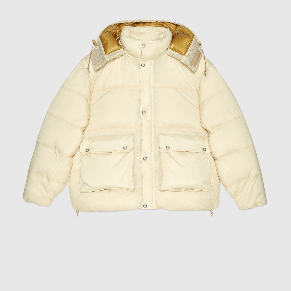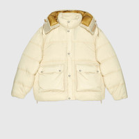 This down padded jacket is part of The North Face x Gucci collection, a collaboration connecting two brands with similar history and values in celebration of the spirit of exploration. The pieces are characterized by a selection of bright colors and prints featuring The North Face x Gucci logo, flowers and woodland-inspired motifs. - Ivory lightweight nylon ripstop with down padding - The North Face x Gucci trail heat transfer on the back - The North Face x Gucci - Detachable hood with drawstring - Front flap patch pockets - Drawstrings at the hem - Snap buttons and zip closure - Length: 23.6", based on a size medium - Made in Vietnam - The model is 5'7" tall. The product shown in this image is a size medium