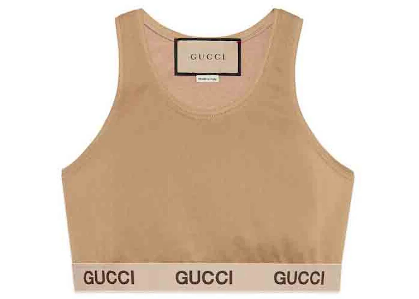 This sleeveless cropped top is part of The North Face x Gucci collection, a collaboration connecting two brands with similar history and values in celebration of the spirit of exploration. The pieces are characterized by a selection of bright colors and prints featuring The North Face x Gucci logo, flowers and woodland-inspired motifs. - Camel technical jersey - The North Face x Gucci Web logo embroidery on the back - The North Face x Gucci - Round neckline - Sleeveless - Elastic band with The North Face x Gucci logo - Cropped - Made in Italy - The model is 5'8" tall. The product shown in this image is a size small