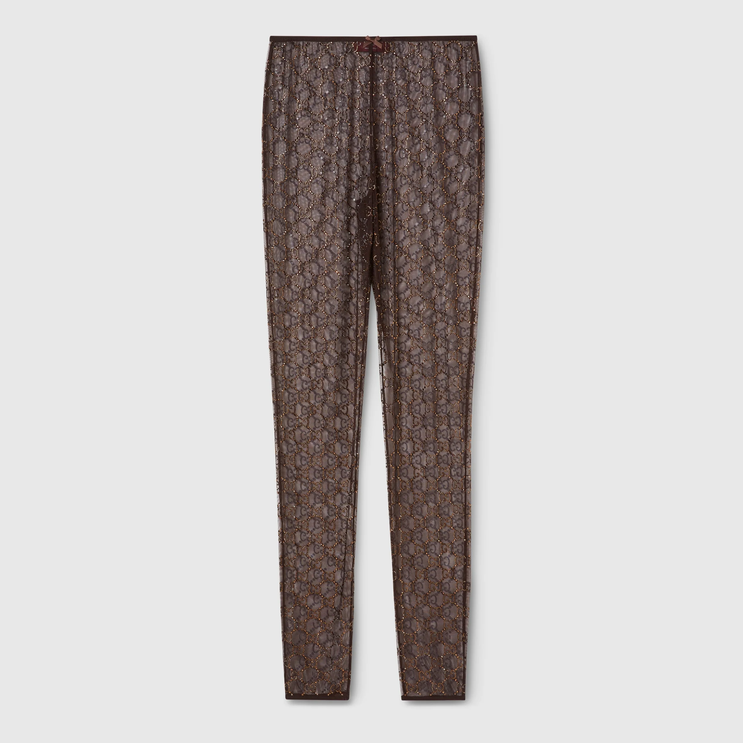 The Cruise 2026 women's ready-to-wear collection reinterprets 1990s modernism with sleek silhouettes, anchored in monochromatic black or white, and effortless separates complete with leggings. Crafted from brown tulle, this pair of leggings is enriched with GG crystals. - Brown tulle - GG crystals - Detachable culotte - Length: 43.3" based on a size XS