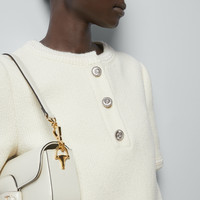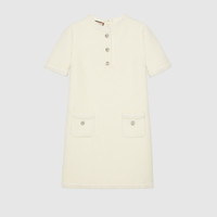 Gucci puts a twist on tweed by innovating the traditional textile with the House's Web design. The new collection's tweed blazers and skirts, which can be worn separately or as a suit, exude colorful style. This sophisticated dress is presented in ivory tweed and completed with a ribbon trim and Interlocking G buttons. - Ivory tweed - Braided trim - Palladium-toned Interlocking G buttons - Lined - Crewneck - Button detail - Short sleeves - Two front pockets - Rear vent - Zip closure - Length: 33.4", based on a size 38 (IT) - Made in Italy - The product shown in this image is a size 38 (IT)