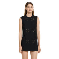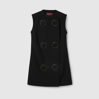 In the Fall Winter 2025 collection, this sleeveless vest is defined by a vintage-inspired silhouette with a round neckline and covered snap button closure. The lined style features lightly padded construction and oversized decorative buttons. - Black dry crepe wool - Lined - Round neckline - Self-covered maxi snap buttons - Length: 28.7"; based on a size 38 (IT) - Made in Italy