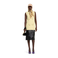 In the Fall Winter 2025 collection, this sleeveless vest is defined by a vintage-inspired silhouette with a round neckline and covered snap button closure. The lined style features lightly padded construction and oversized decorative buttons. - Light yellow textured viscose - Lined - Round neckline - Self-covered maxi snap buttons - Length: 28.7"; based on a size 38 (IT) - Made in Italy
