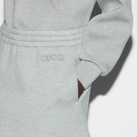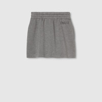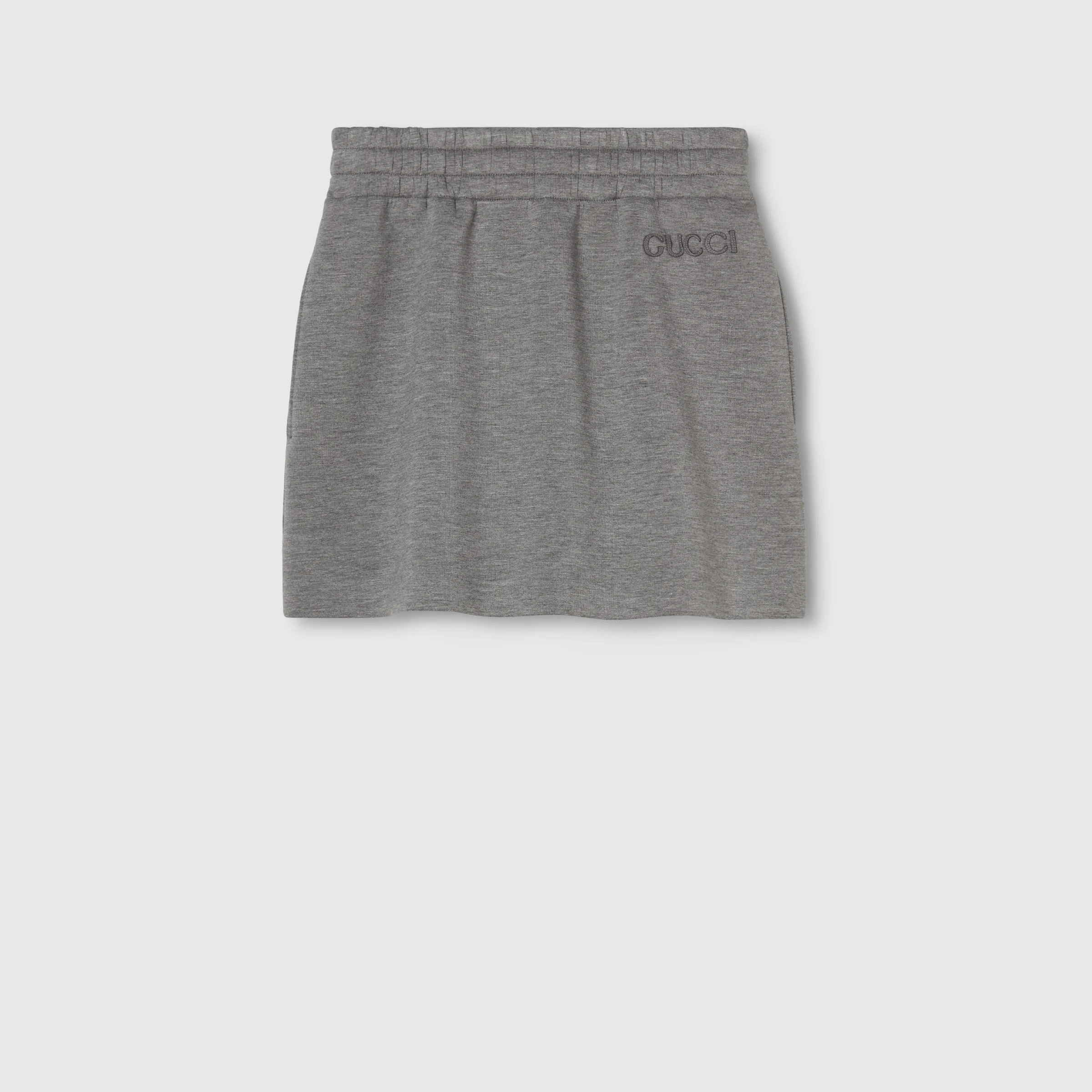 Signature patterns have been re-envisioned in unexpected versions, juxtaposed with new silhouettes on jackets, oversized shirts and pajama ensembles. This mini skirt is made from a soft viscose jersey and is enriched with a Gucci embroidery. - Grey viscose jersey - Gucci embroidery - Elastic waist with drawstring closure - Two side pockets - Rib trim - Regular fit - Length: 14.3"; based on a size S - Made in Italy - The product shown in the image is a size small