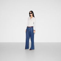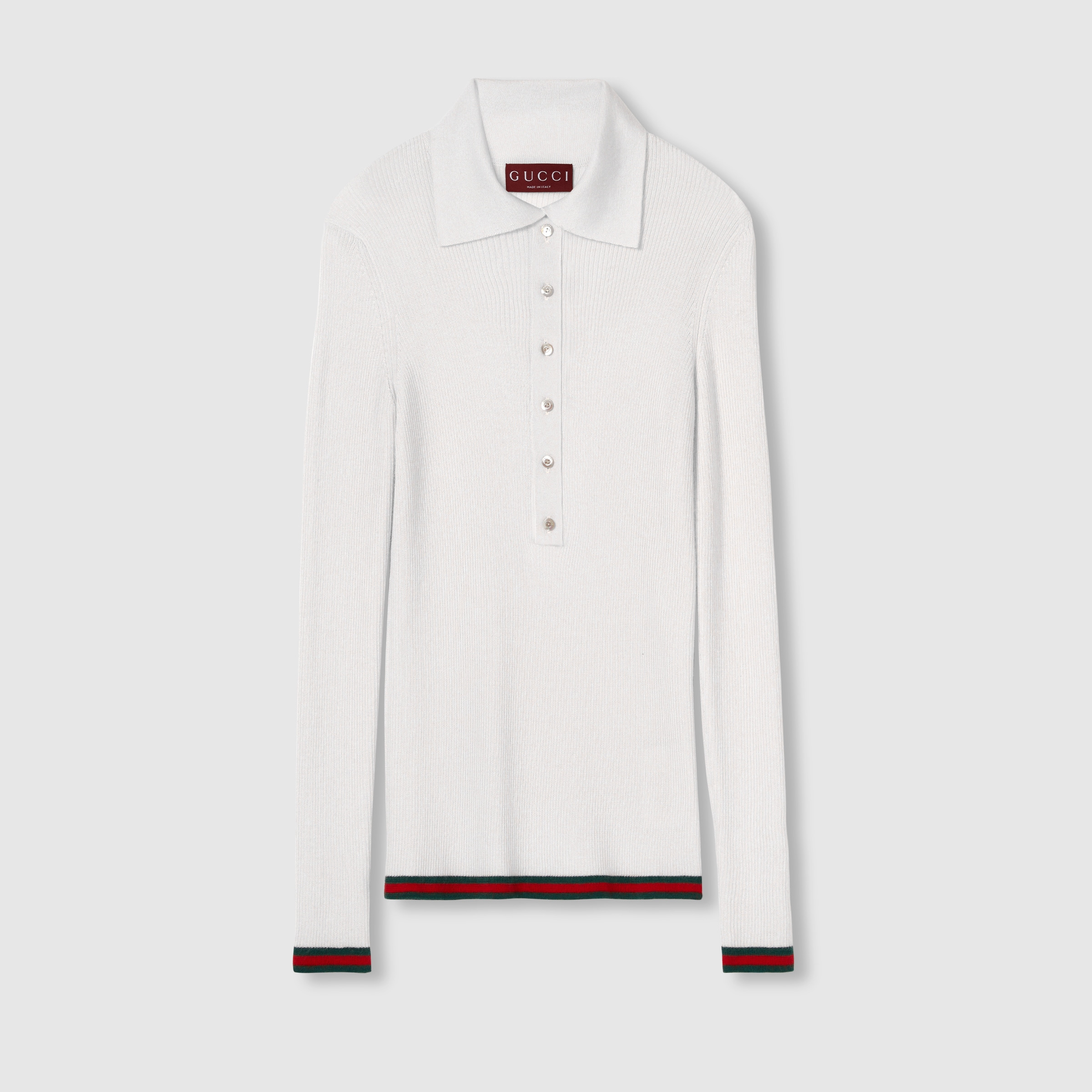 Gucci's House codes continue to evolve for the new season across relaxed jersey pieces. Crafted from an extra fine cashmere and silk rib, this polo top reveals a Gucci intarsia and reveals a green and red Web trim across the cuffs and hem. - White extra fine cashmere and silk rib - Gucci intarsia - Polo collar - Long sleeves - Web trim - Button closure - Length: 25.2"; Shoulder: 11"; Half waist/chest: 12.6"; Sleeves length: 25.2" based on a size S - Made in Italy - The product shown in this image is a size small