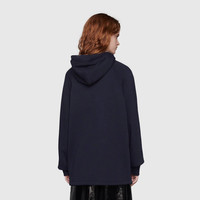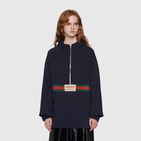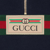 Taking cues from the archives, the Web is a key element of Gucci's collections and reinforces the homage paid to Gucci's past. Paired on this ink blue sweatshirt with the vintage Gucci logo, it stands as a reference to the equestrian heritage of the House. - Ink blue heavy felted cotton jersey - Web with vintage Gucci logo - Fixed hood - Partial zip - Front pocket - Length: 27.5", based on a size medium - Made in Italy - The model is 5'8" tall. The product shown in this image is a size medium