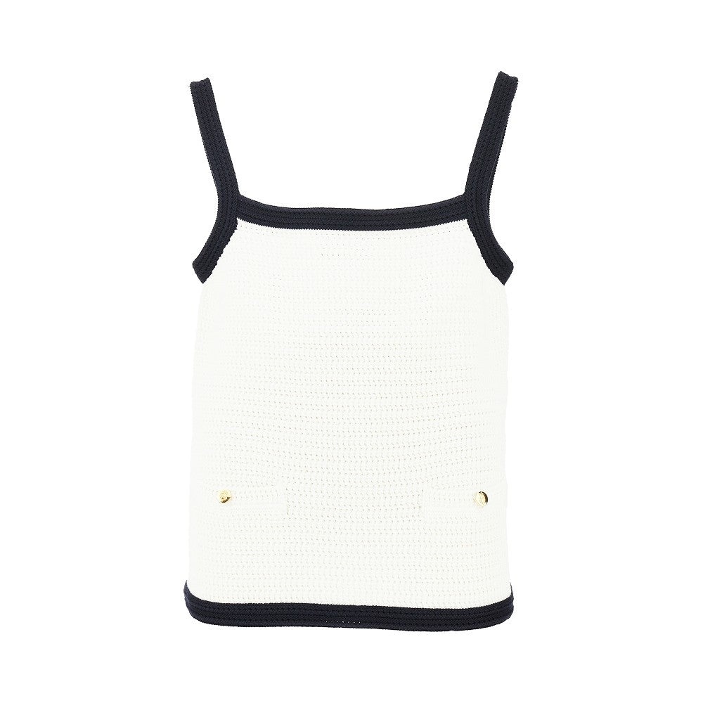 Sleeveless top made from thick stretch cotton knitted fabric with contrasting trims, featuring side welt pockets with gold-finished metal buttons with embossed Interlocking GG crest. Squared neckline. Straight and regular cut. DETAILS Codice Modello: 819376 Stagione: SS25 Materiale: 97% CO, 2% PA, 1% EA Made in: Italy Sku: 22320 Brand: GUCCI