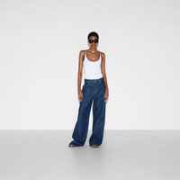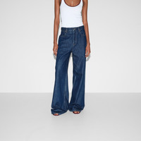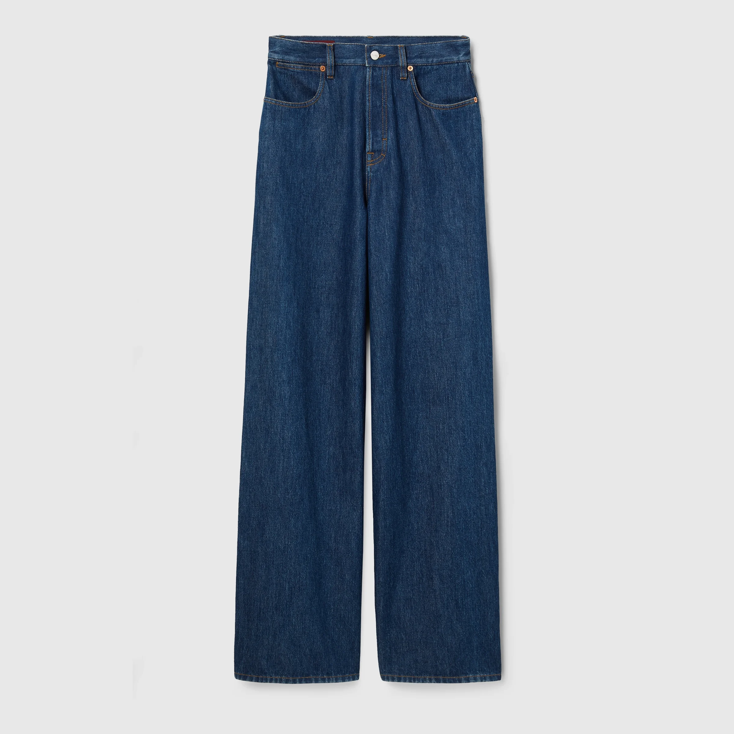 The Cruise 2025 collection introduces a fresh take on denim, with subtle details that elevate everyday looks. Cut from a washed certified cotton denim, these wide-leg pants are finished with a Gucci Rosso Ancora naplak label. - Dark blue washed certified cotton denim - Debossed Gucci label - Five pocket style - Button and zip closure - Wide leg - Length: 46.8"; Half waist: 15.4"; Half hips: 18.3"; Half hem width: 12" based on a size 25 - Made in Italy - The product shown in this image is a size 25 (IT)
