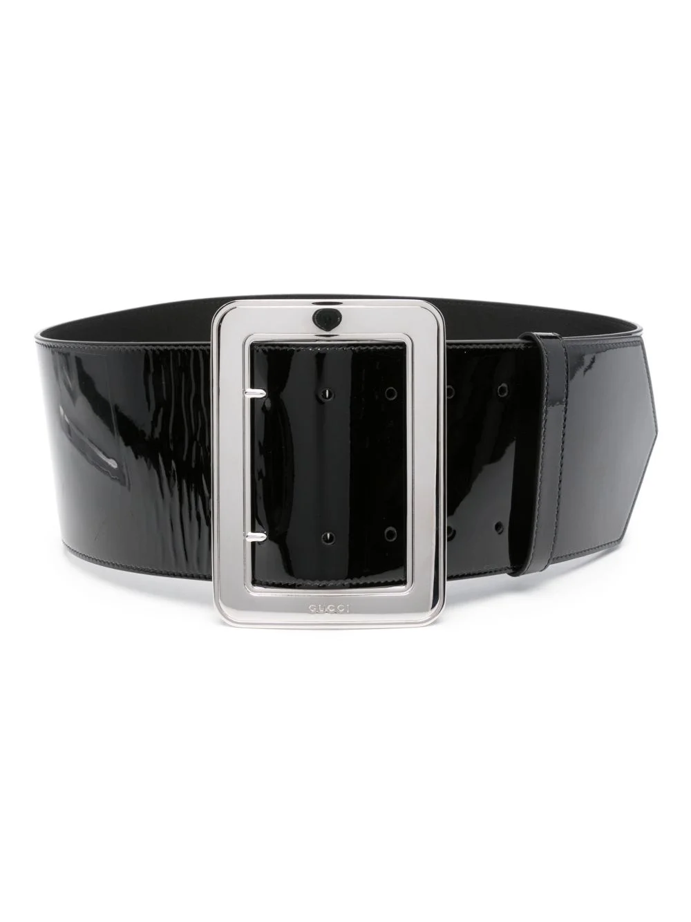 logo-engraved leather belt Gucci's Exquisite collection recalls styles from the 50s, including for the label's accessory line. The Italian house revives the wide belt, reimagining it in a shiny patent leather construction. Highlights - Black - Calf leather - Patent finish - Wide style - Logo-engraved buckle - Silver-tone hardware - Punched holes - Adjustable fit - Buckle fastening Made in Italy Composition Patent Calf Leather 100% SIZE & FIT Measurement Maximum Length 33.46 in(85 cm) Minimum Length 29.52 in(75 cm) WIDTH 3.74 in(9.5 cm)