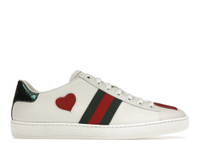 The Ace low-top sneaker is presented in white leather and accentuated with inlaid red heart details. The style is completed by the House Web in its recognizable green and red color combination. - White leather with red leather heart inlay - Green and red Web - Red leather detail on the back of one shoe and green on the other - Rubber sole - These shoes run big, we recommend sizing down one size - Made in Italy