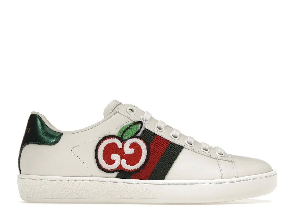 Crafted from soft, white leather, the emblematic women's Ace sneaker is enhanced with a new motif for Cruise 2020. In a playful reinterpretation of a classic House code, a red apple outlined by the GG logo animates the classic low-top design. - White leather - Women's - GG apple patch - Green and red Web - Green metallic leather on the back of one shoe, red on the other - Rubber sole - These shoes run big, we recommend sizing down one size - .8" height - Made in Italy