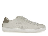 Crafted from soft, white leather, the emblematic Ace sneaker is enhanced with a minimalist logo approach. With an intricate design, the Interlocking G is displayed on the side of the shoe, created using a perforated technique. Grey leather details at the back of the shoe add a subtle hint of color to the all-white style. - White leather - Women's - Perforated Interlocking G - Grey leather detail at the back - Rubber sole - Flat - .8" height - Made in Italy - These shoes run big, we recommend sizing down one size