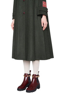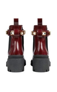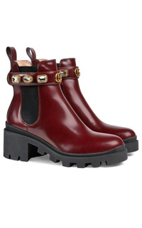 The ankle boot in shiny burgundy leather is designed with a lug sole and elastic inserts on each side for a pull-on entry. Completed with a detachable ankle strap dotted with sparkling crystals encased within engraved trims, resembling vintage jewels. The emblematic Double G finishes the front. - Burgundy leather - Women's - Detachable ankle belt with crystals and Double G - 2.4" heel height with .8" platform - 5.5" shaft height - Made in Italy